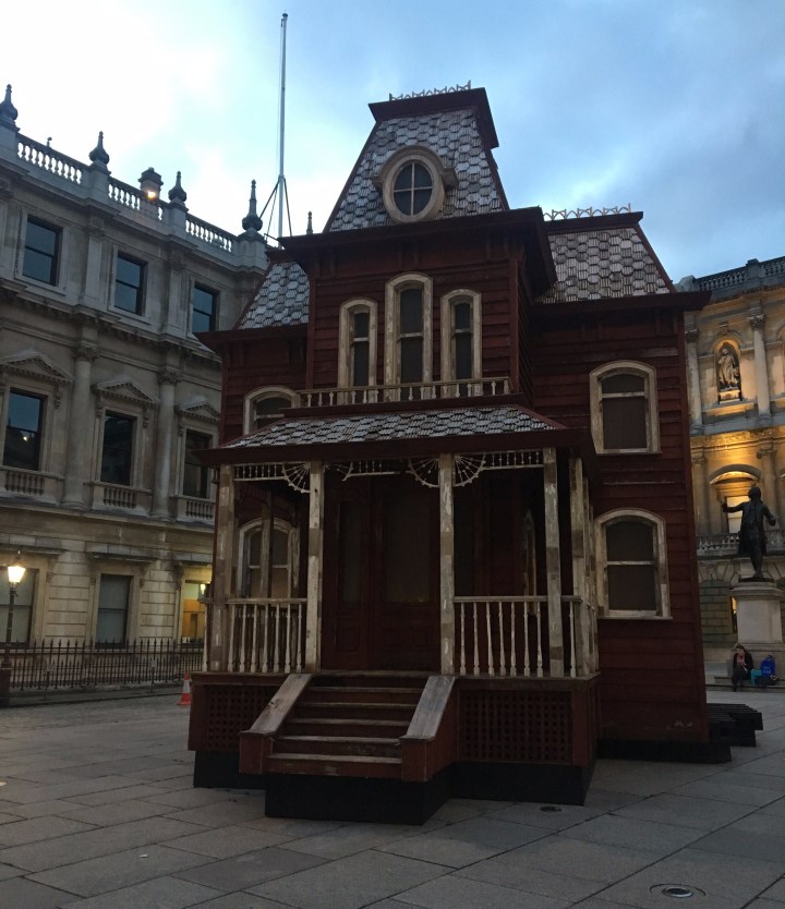 Cornelia Parker’s genius strikes again and this time, in the courtyard of the Burlington House at the Royal Academy of Arts in London. Her installation, Transitional Object (Psychobarn), is a façade held by scaffoldings, reproducing the house built for Hitchcock’s movie Psycho (1960).