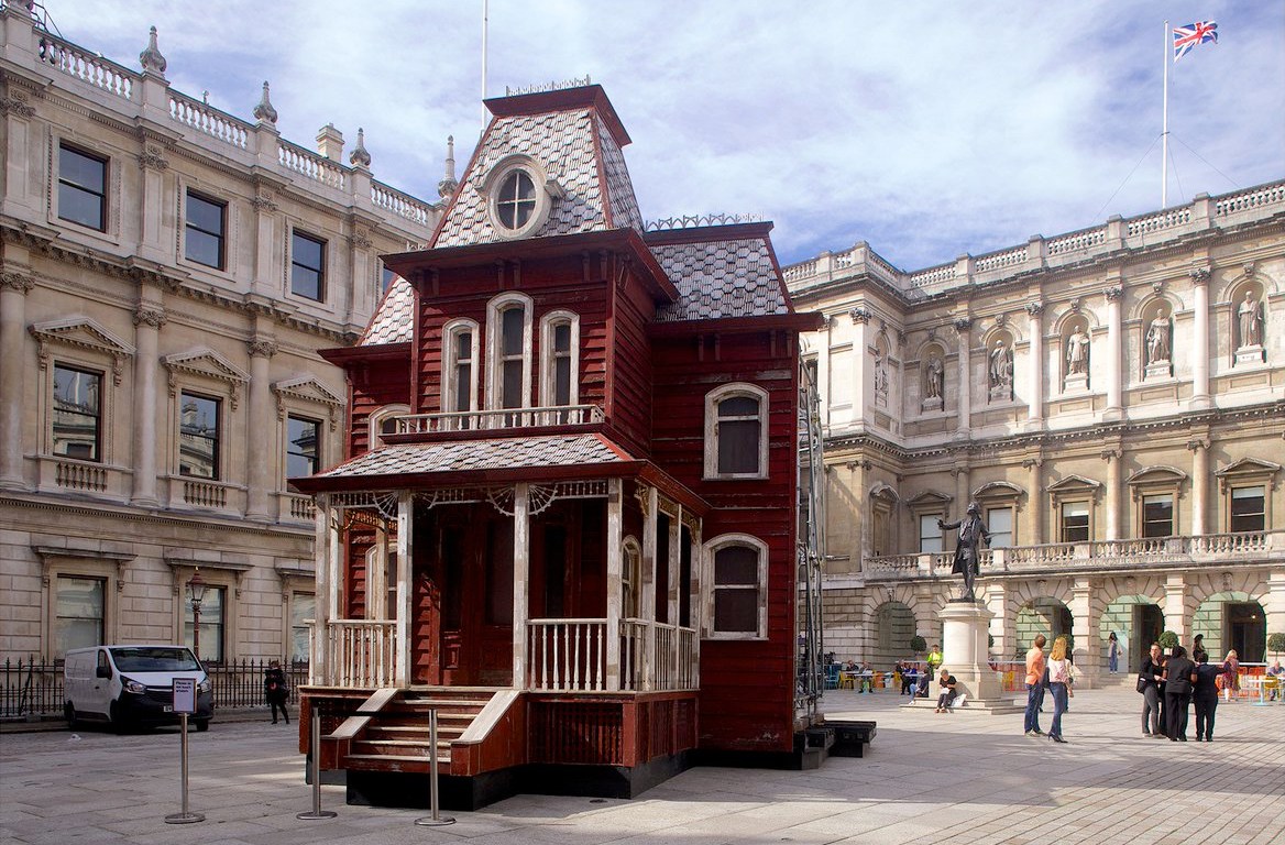Cornelia Parker’s genius strikes again and this time, in the courtyard of the Burlington House at the Royal Academy of Arts in London. Her installation, Transitional Object (Psychobarn), is a façade held by scaffoldings, reproducing the house built for Hitchcock’s movie Psycho (1960).